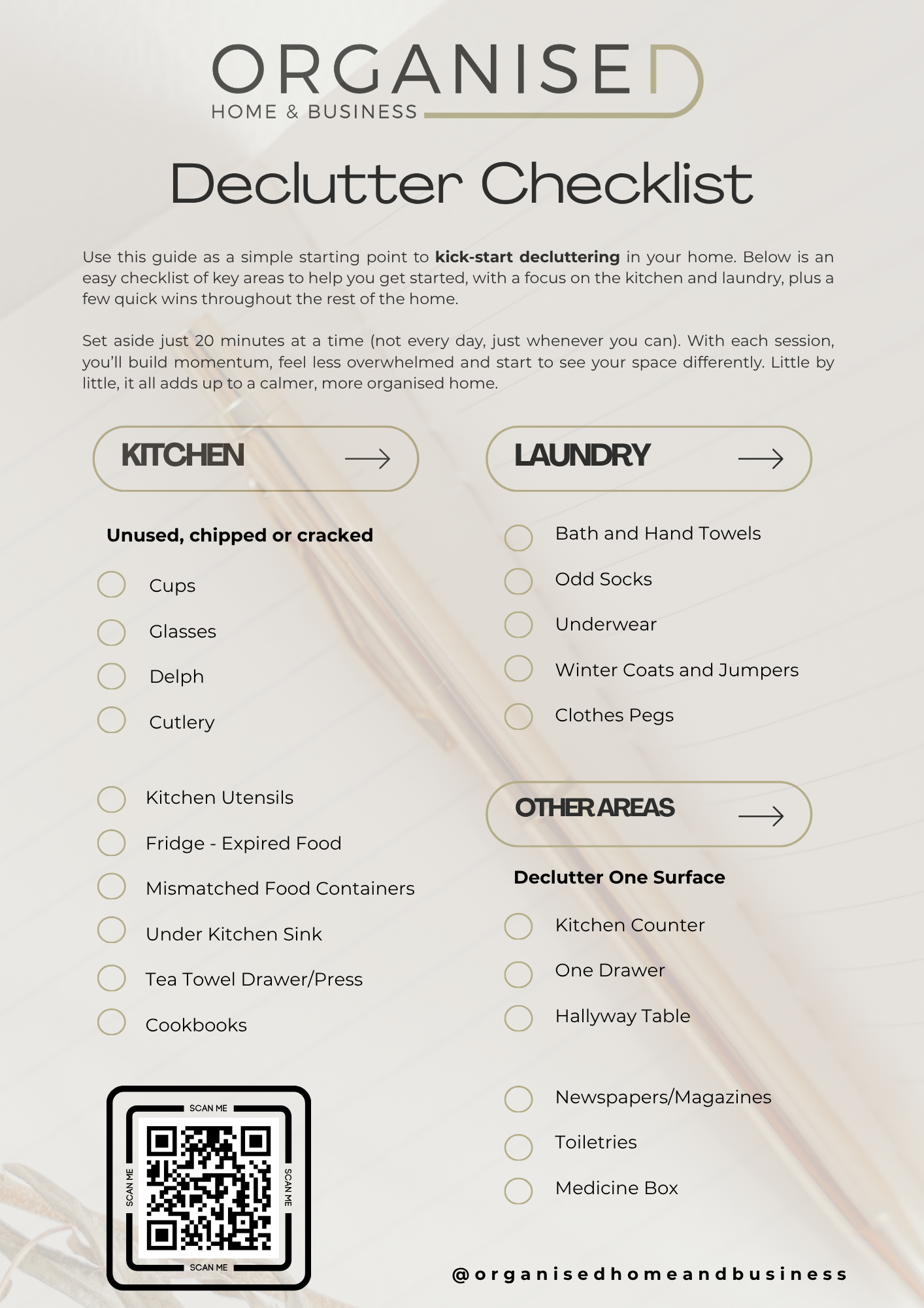 A more organised home doesn’t happen overnight, but small, consistent steps can make a big difference to how your space feels. Use this guide as a simple starting point to kick‑start decluttering in your home. Click the image below to download.