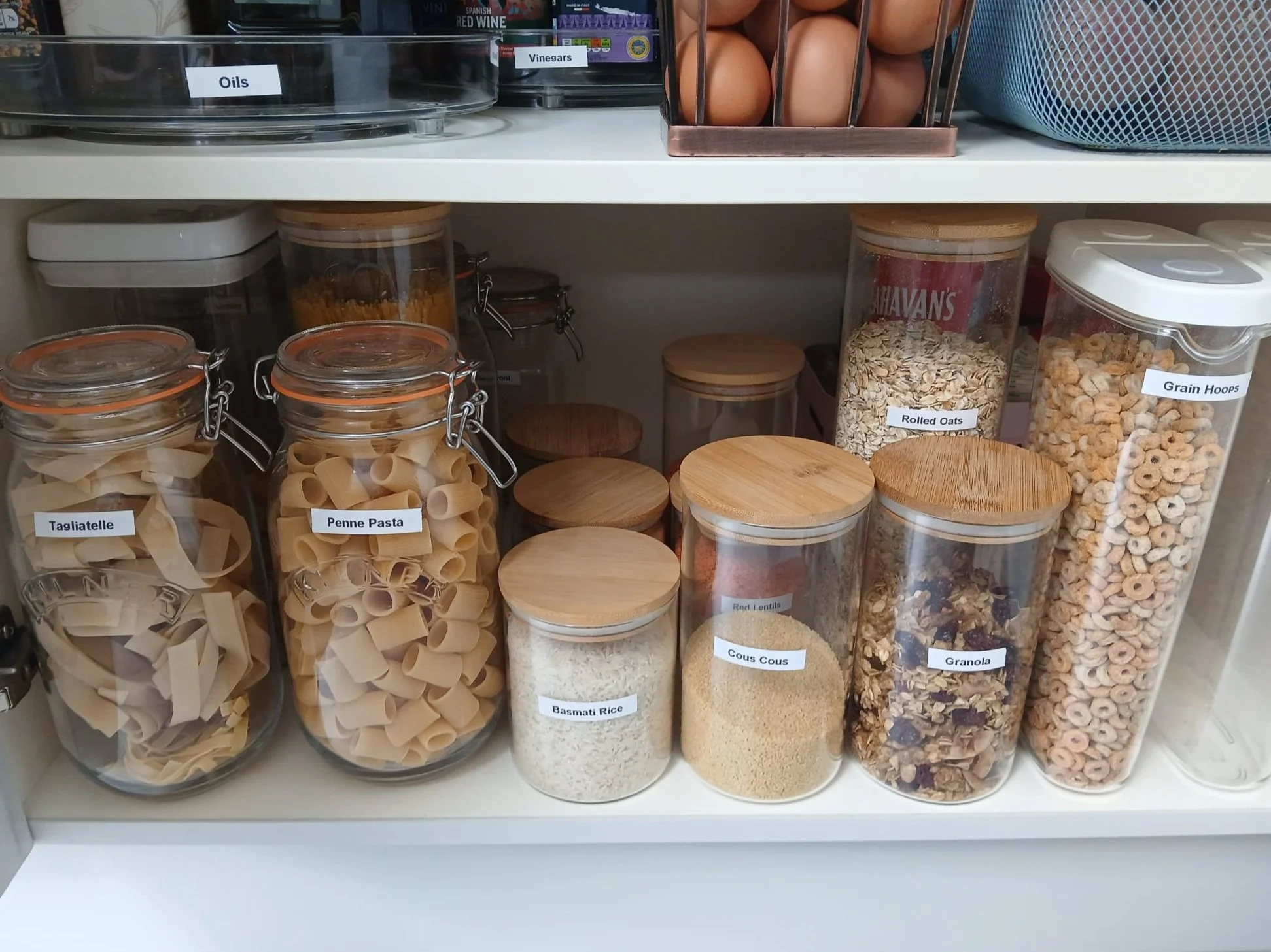 Start with good quality, clear, airtight containers. Clear containers allow you to instantly see what's inside without opening everything. Airtight lids help keep food fresh longer and protect against pests. You don’t have to spend a fortune, you can build your collection slowly. Glass jars, BPA-free plastic containers, or even upcycled jars from the supermarket all work well.